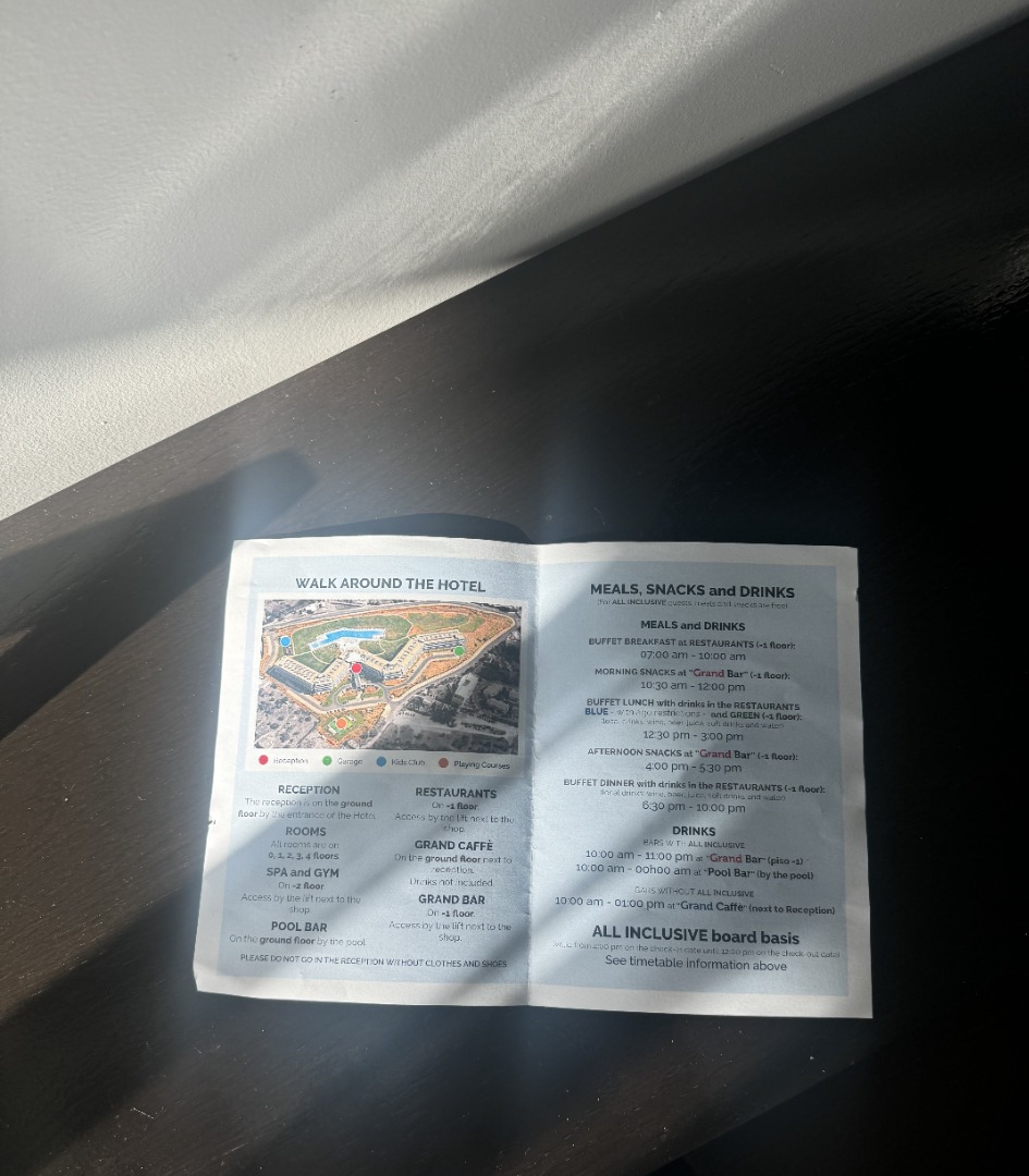 - Pozostałe informacje: room service (płatny), sala konferencyjna, sklepik z prasą, pralnia (płatna), przechowalnia bagażu, wypożyczalnia samochodów, parking, taras słoneczny z leżakami i parasolami.