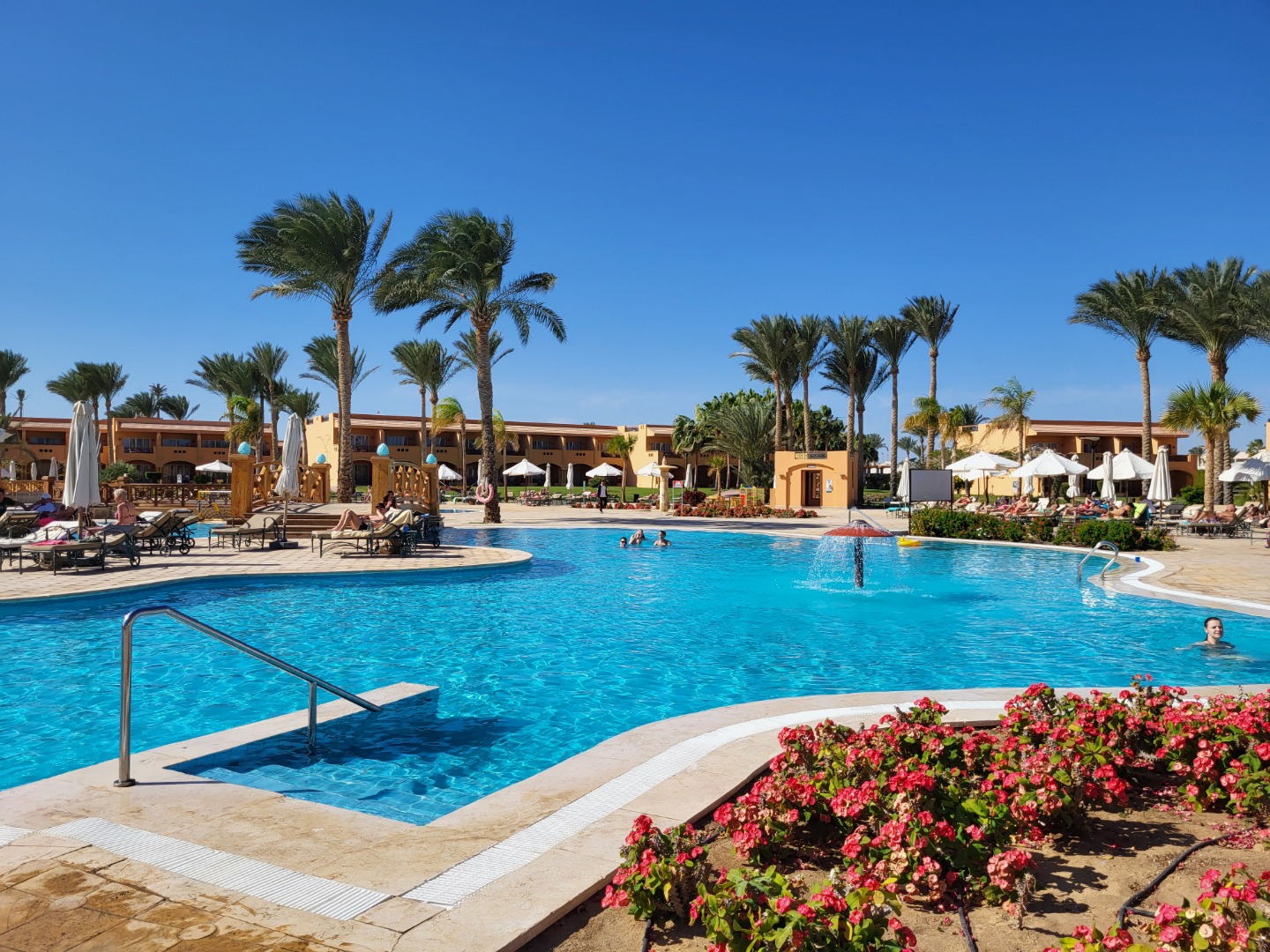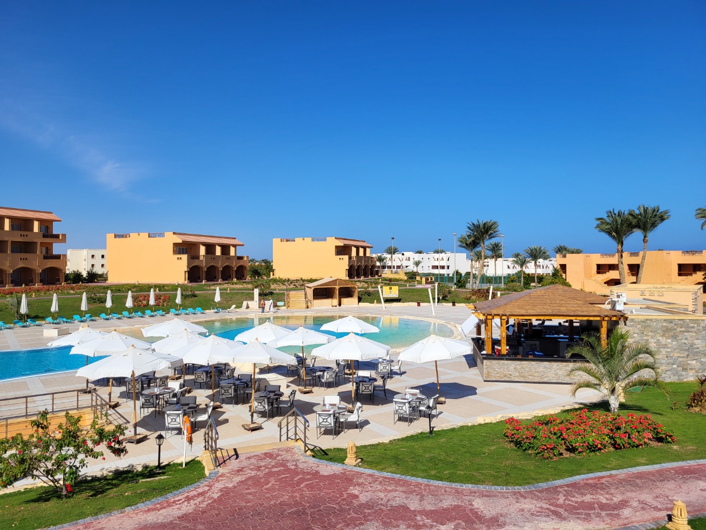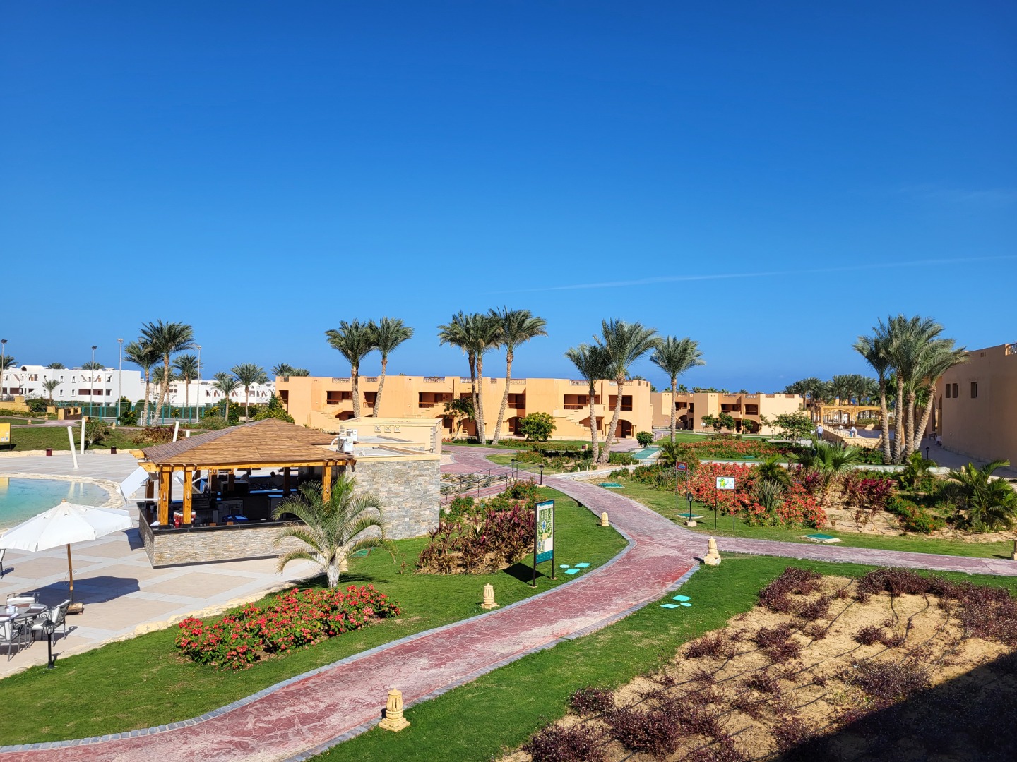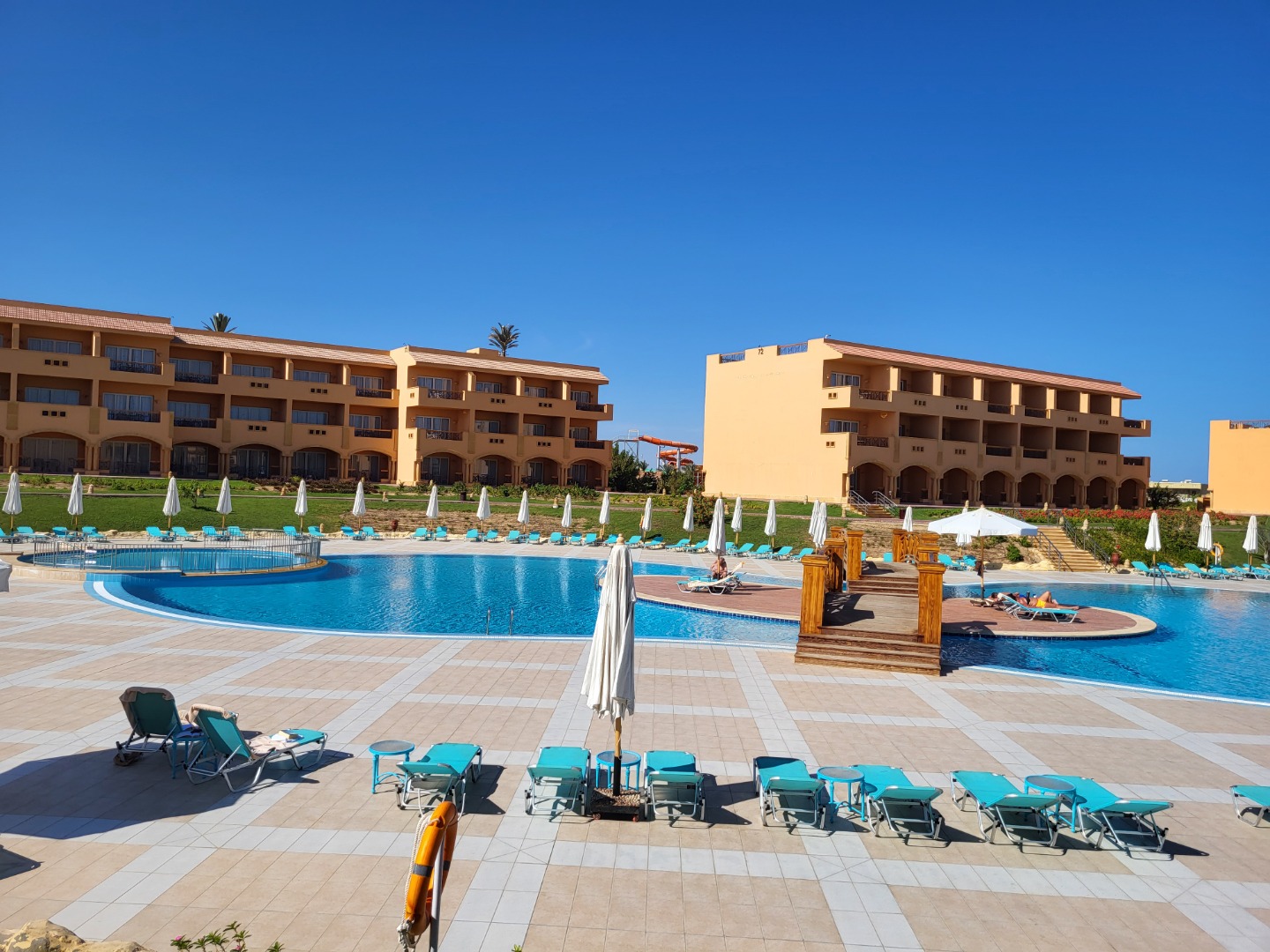 Najstarsza część z Jazów, aquapark płatny - 45 euro/dorosły i 30 euro/dziecko za tydzień. Hotel podzielony na 2 części spokojniejszą dalej od plaży i główną przy plaży. Plaża klifowa, wejście w butach i pomost do rafy, ale goście narzekają, że wiecznie czerwona flaga. Jedzenie dobre, chwalą. Wifi free, ale tylko do prędkości 1mb. W hotelu jest bankomat i sklepiki. Pokoje bardzo porządne, rodzinne 1 pomieszczenie.