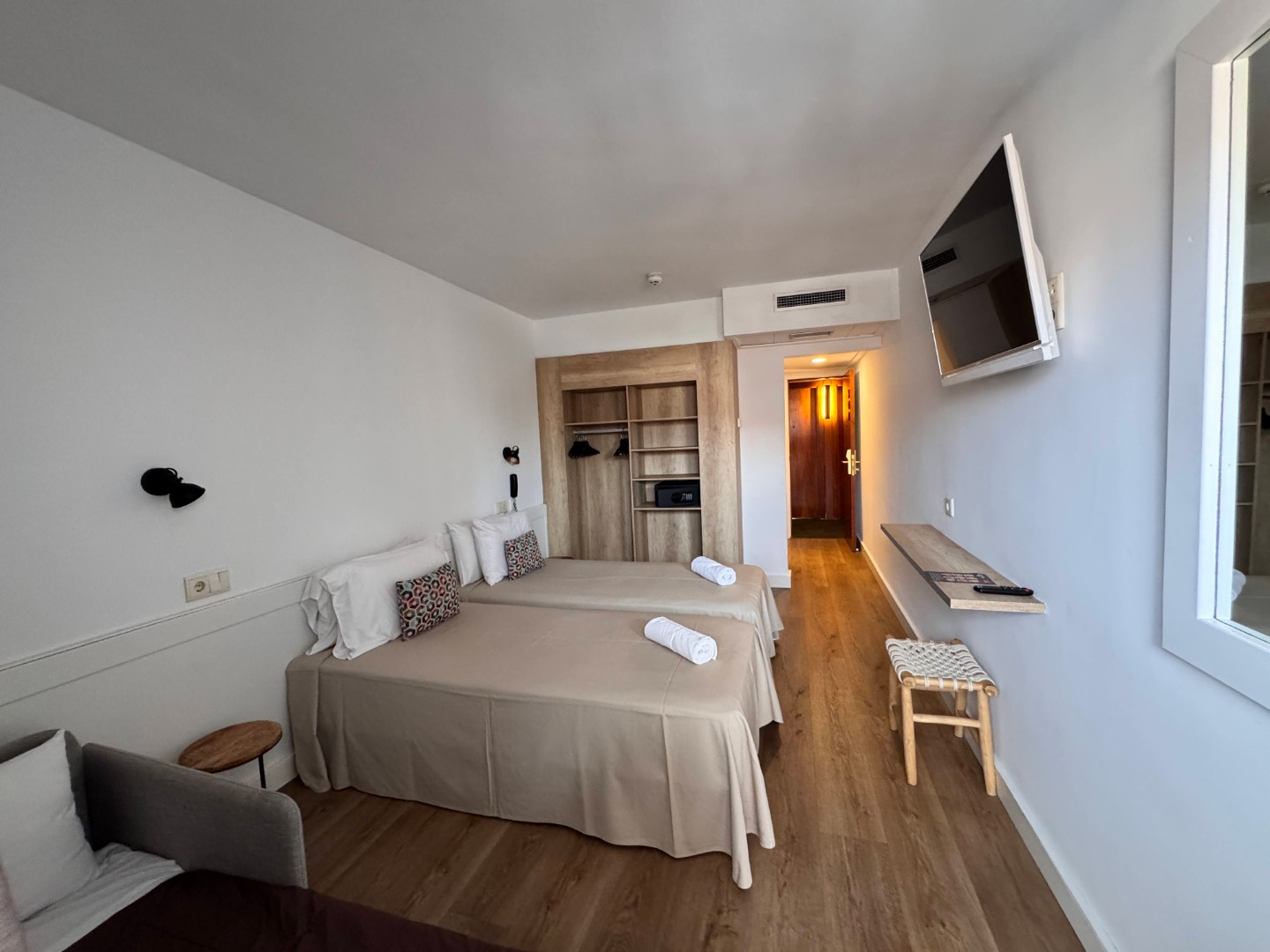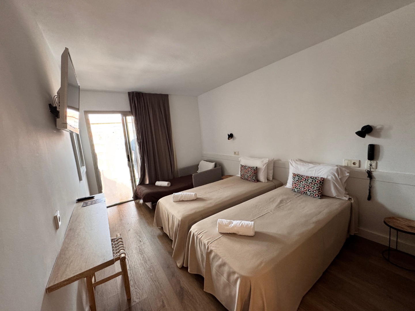 - Pokój trzyosobowy (triple): Powierzchnia ok. 21 m², dla maksymalnie 3 osób, jedno łóżko podwójne lub dwa łóżka pojedyncze oraz sofa lub dostawka. Balkon lub taras, widok na miasto lub basen.