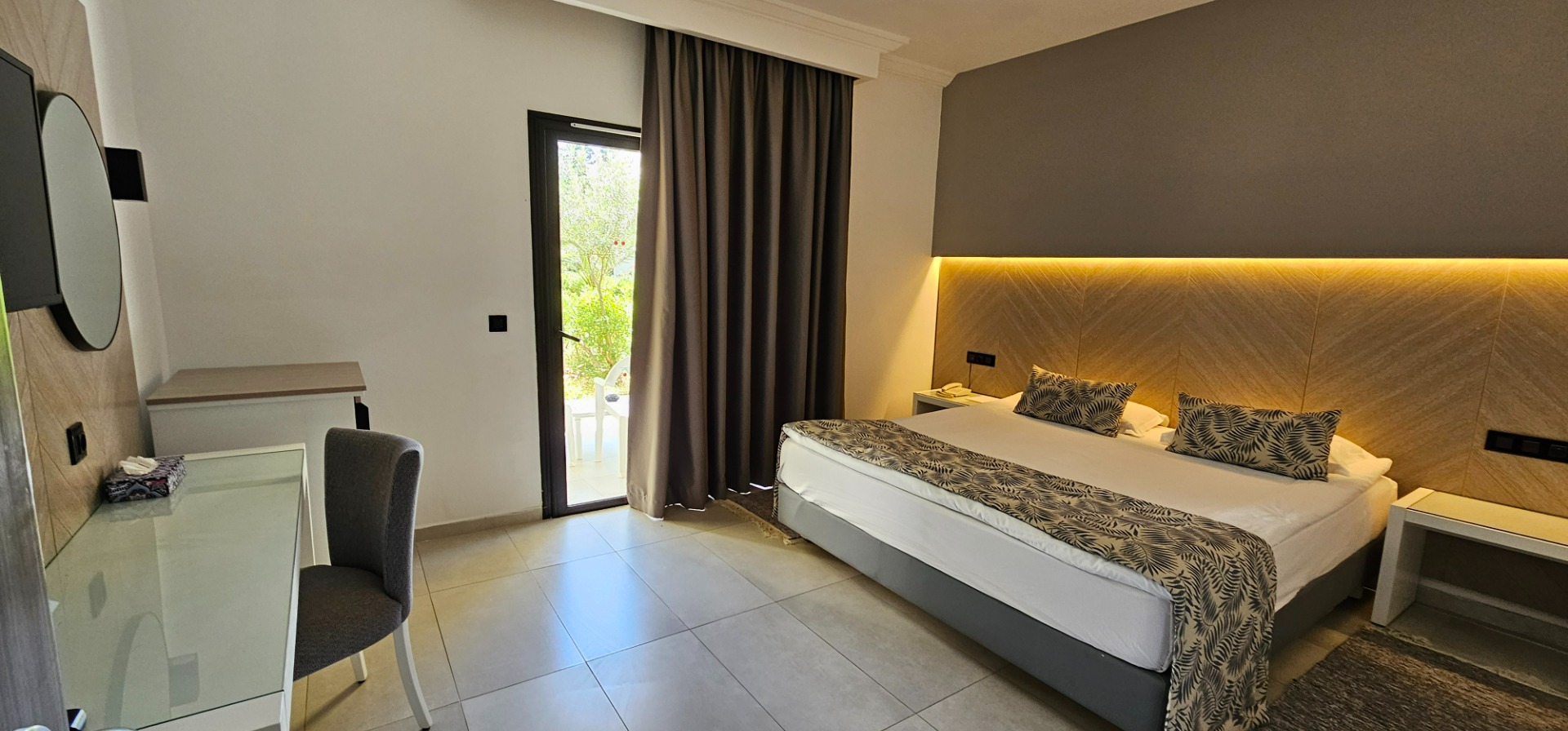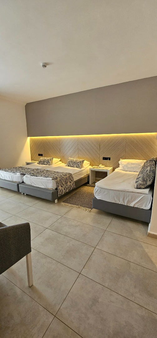 • Pokój standardowy trzyosobowy: Powierzchnia ok. 28 m², dla maksymalnie 3 osób, widok na ogród lub boczny widok na morze, balkon.