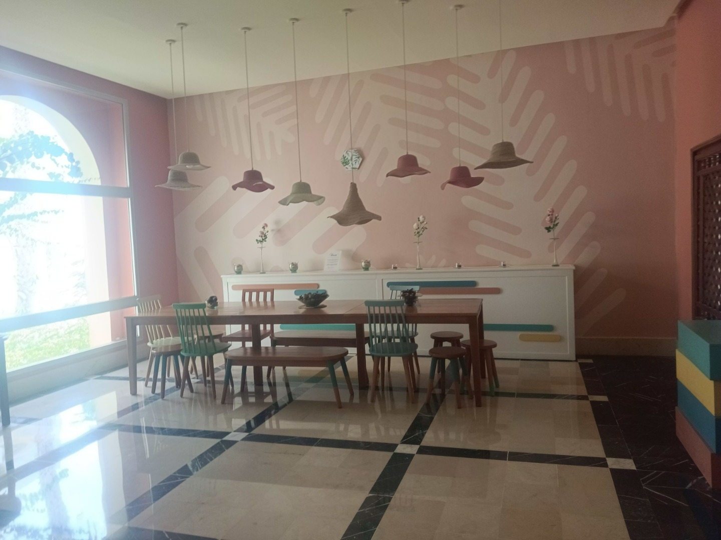 - Restauracja główna – dania w formie bufetu, dostępne foteliki dla dzieci oraz punkt przygotowania posiłków dla dzieci.