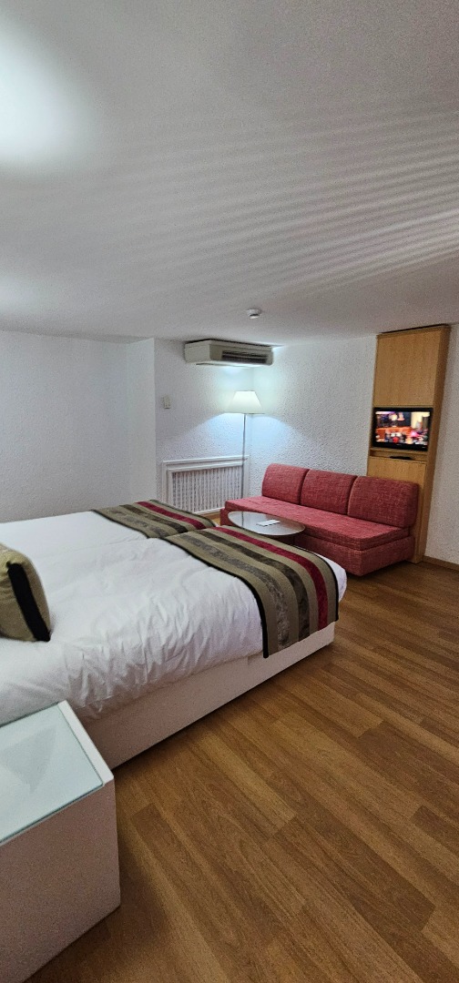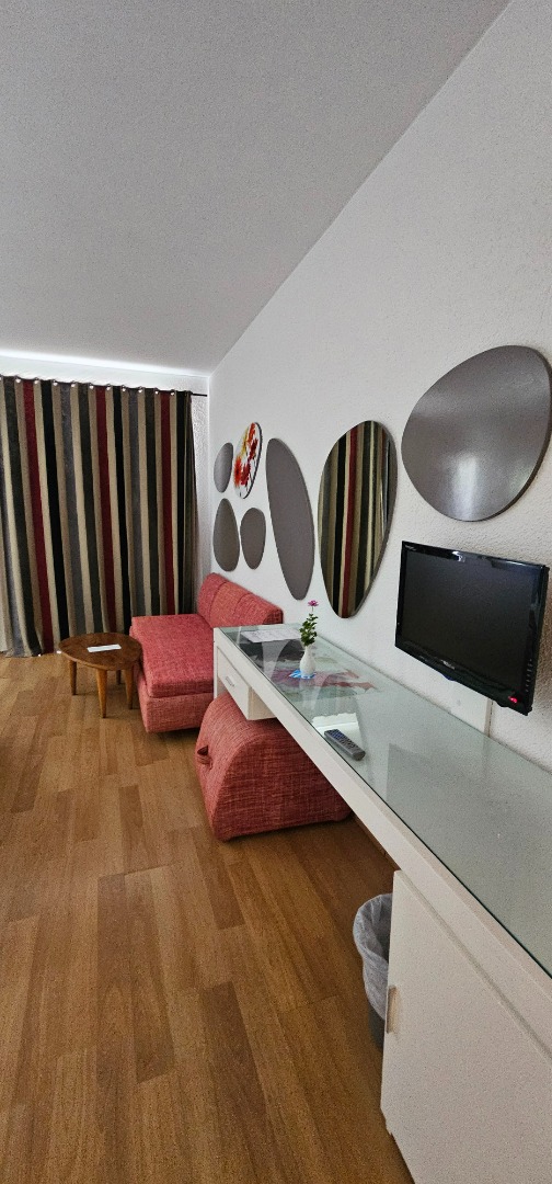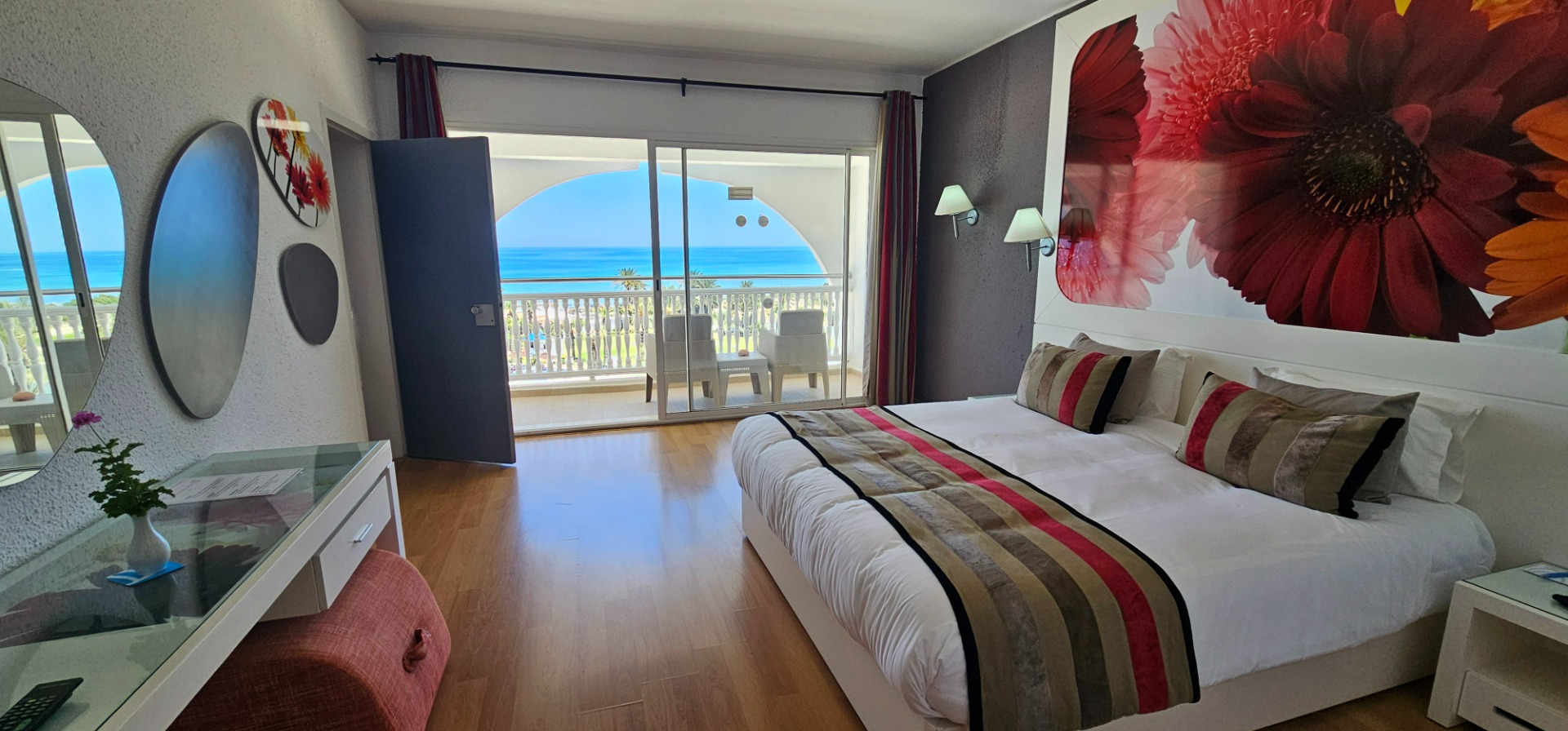 • Family Room: Powierzchnia ok. 46 m², dla maksymalnie 5 osób, dwa warianty: duży pokój ze strefą dzienną lub pokój z dwiema sypialniami. Wyposażenie jak w pokoju standardowym, umeblowany balkon lub taras, widok na teren hotelu lub morze.