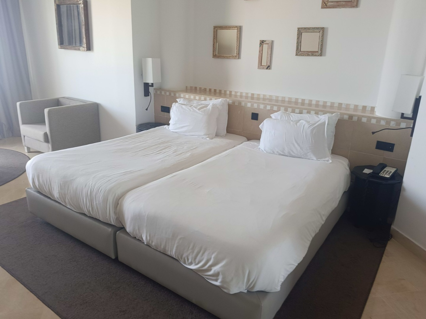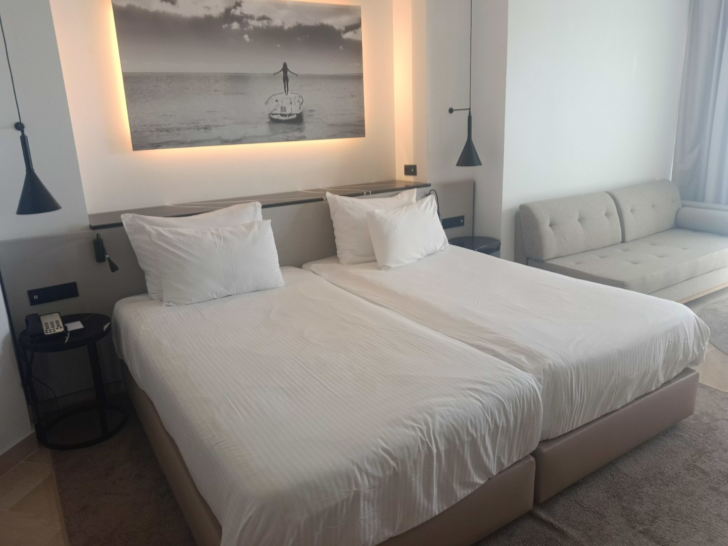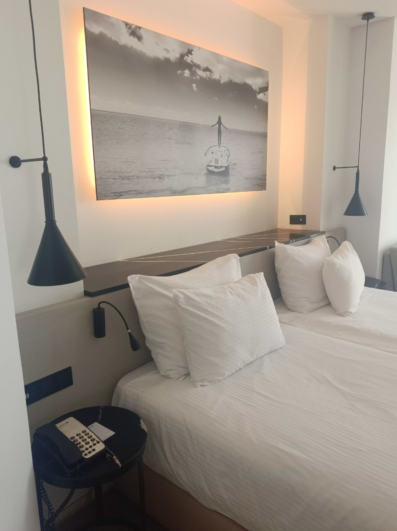 - Pokój 2-osobowy superior z widokiem: Przestronny pokój z widokiem na morze, wyposażony w klimatyzację, minibar, szlafroki, kapcie, sejf, balkon oraz łazienkę z prysznicem. Możliwość dostawki na sofie dla 2 dzieci lub 1 osoby dorosłej.