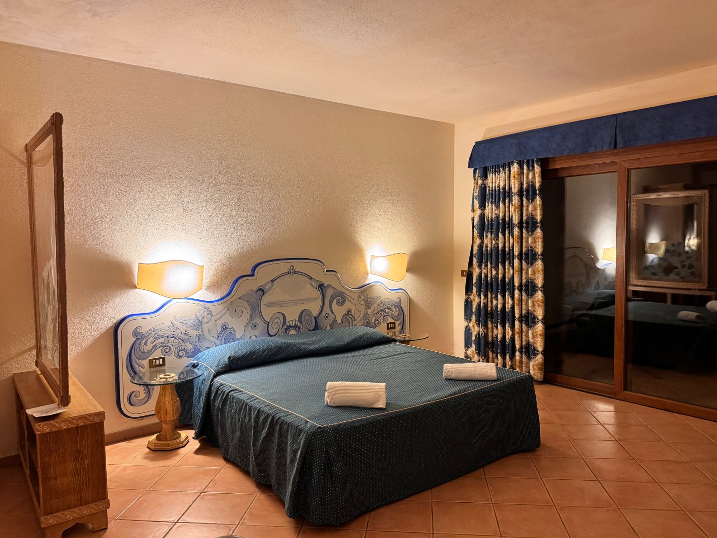 - Pokój standardowy w części Borgo: Powierzchnia ok. 28 m², dla 2 osób z możliwością 1 lub 2 dostawek dla dzieci, optycznie wydzielona część dzienna. Indywidualnie sterowana klimatyzacja (czynna w terminie 15.06-15.09), łazienka z prysznicem, WC i suszarką do włosów, telewizor, sejf, balkon lub taras (większość pokoi z widokiem na basen), minibar (płatny), łóżeczko dla dziecka do 2 lat na zamówienie za opłatą.