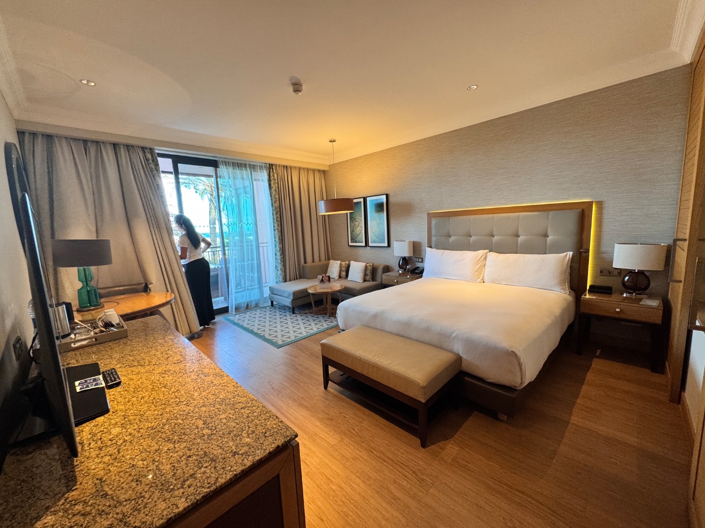 King Deluxe Suite (pow. ok. 73 m2) - max 4 os. Osobna sypialnia w łóżkiem typu king-size. Serwis kawowy. Żelazko/deska do prasowania. Specjalne dodatki obejmują szlafroki, pantofle. Minibar. Sejf. Balkon lub taras. Dostawka w formie kanapy. Widok na ocean i basen.