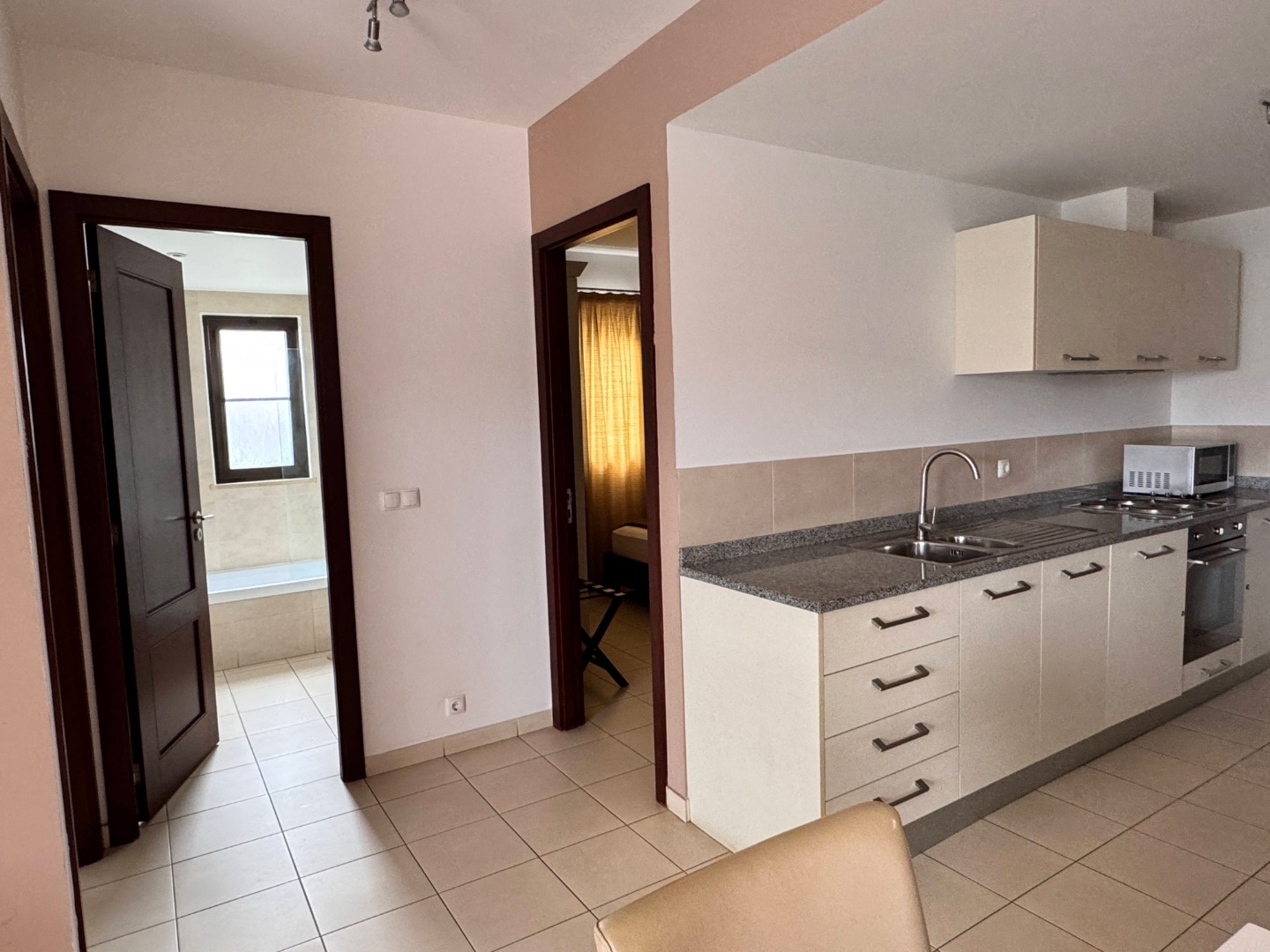 Suite z 2 sypialniami (pow. ok. 60 m2) – dla 4 osób. 2 sypialnie (w jednej łóżko małżeńskie, w drugiej pojedyncze łóżka), salon z aneksem kuchennym. Widok na ogród.