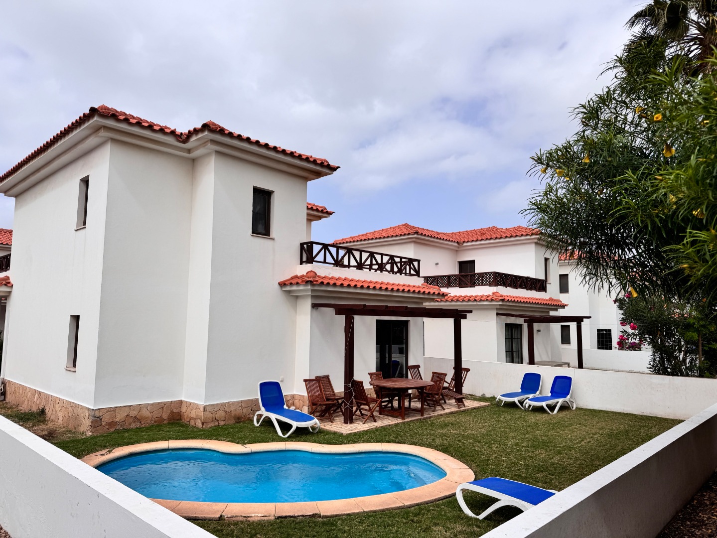 Willa z 3 sypialniami (pow. ok. 115 m2) – dla max 6 osób, 2-poziomowe, 3 sypialnie (w jednej łóżko małżeńskie, w pozostałych dwóch pojedyncze łóżka), salon, trzy łazienki. Prywatny basen. Widok na ogród